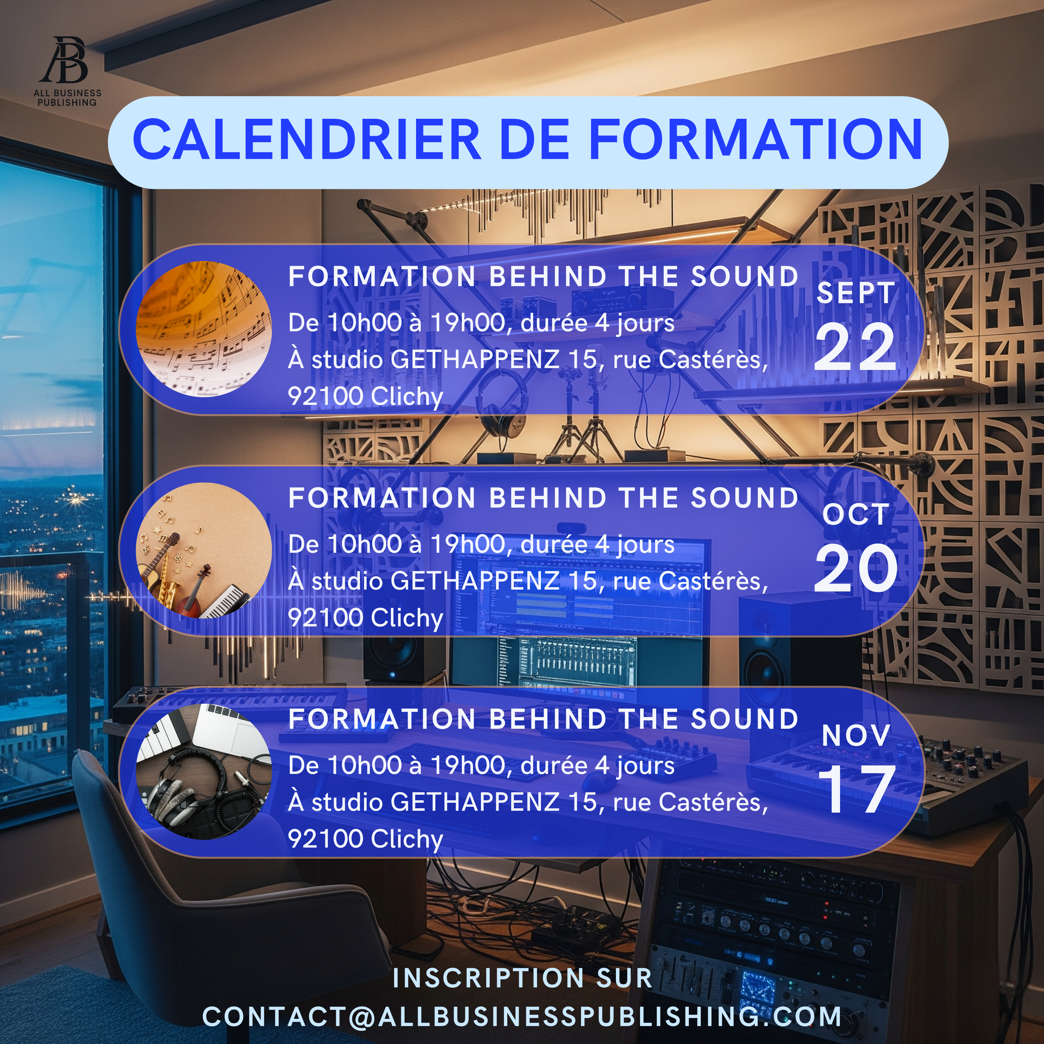Découvrez nos formations "Behind the Sound", conçues pour les musiciens talentueux qui souhaitent vivre de leur art. Apprenez à maîtriser la stratégie, la communication et le business pour devenir un professionnel recherché.